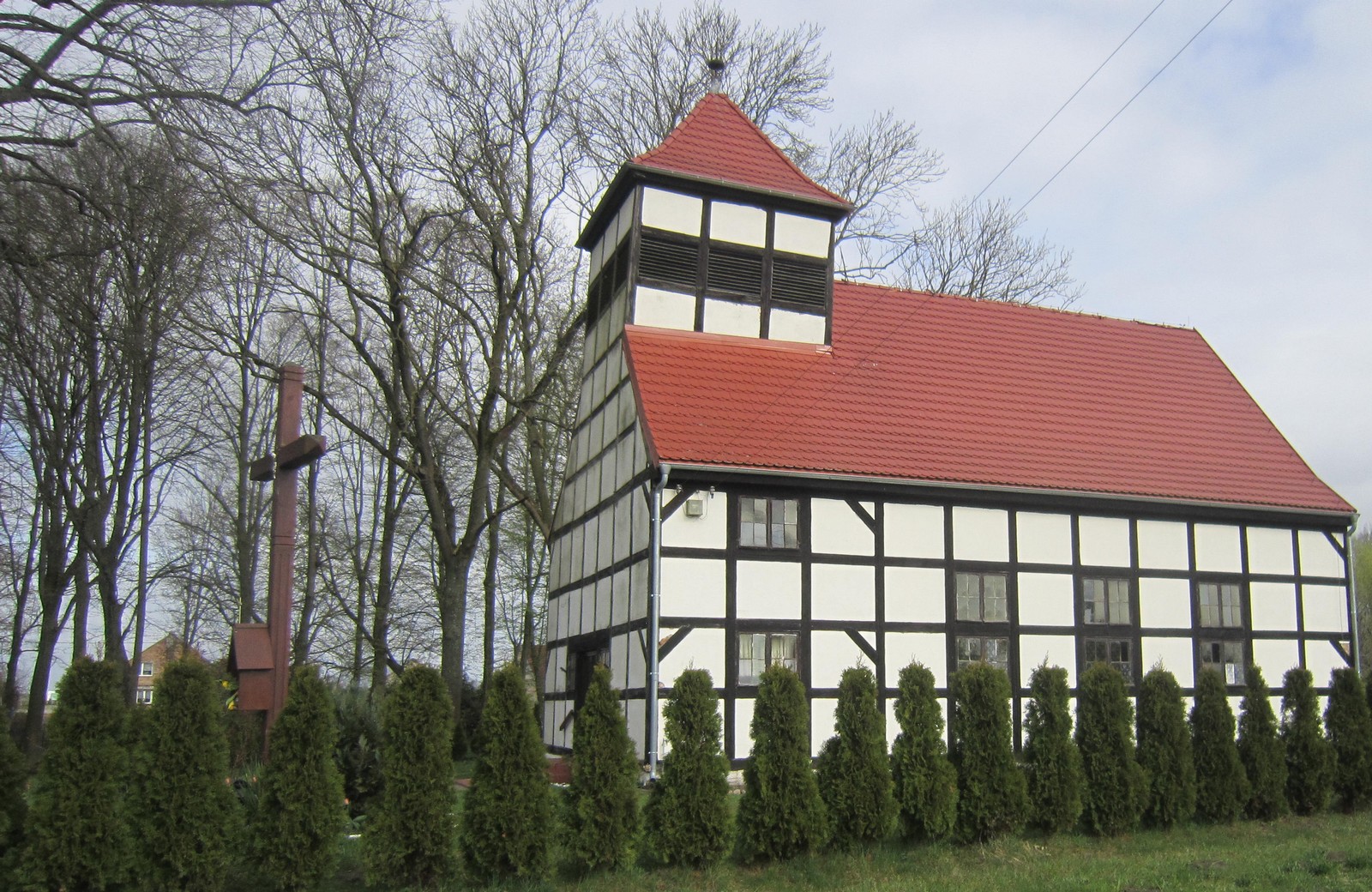 | Kościół wzniesiony w latach 1807-1812 o konstrukcji szkieletowej drewnianej z ceglanym wypełnieniem pól miedzy ryglowych. Poświęcony 11. XI. 1945 r. Odpust: 11. XI. Założony na rzucie prostokąta, salowy z niską wieżą, wyrastającą z korpusu przy szczycie zachodnim oraz wydzielonymi również przy zachodniej ścianie –przedsionkiem i zakrystią. Kościół jest obiektem zabytkowym nr rej. A-1230 z 30.08.1993 r. |